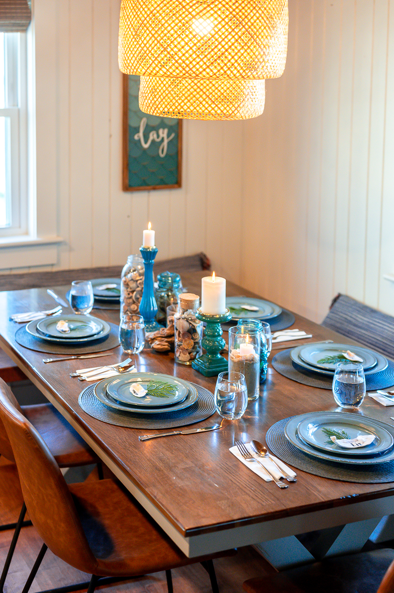 For the place tags, write your guests’ names on the inside of oyster or scallop shells with a paint pen or sharpie. A little greenery from the backyard will give them a holiday feel!