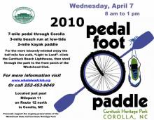 Whew! Just thinking about this makes me want to reach for the Bengay! On Wednesday, April 7th, Currituck Heritage Park in Corolla, NC will host "Pedal-Foot-Paddle." It's a new take on the classic triathlon. The event will begin with a 7-mile bike ride, followed by a 3-mile beach run and finishing with a 2-mile kayak paddle on the Currituck Sound.